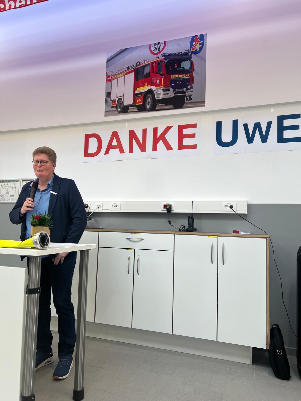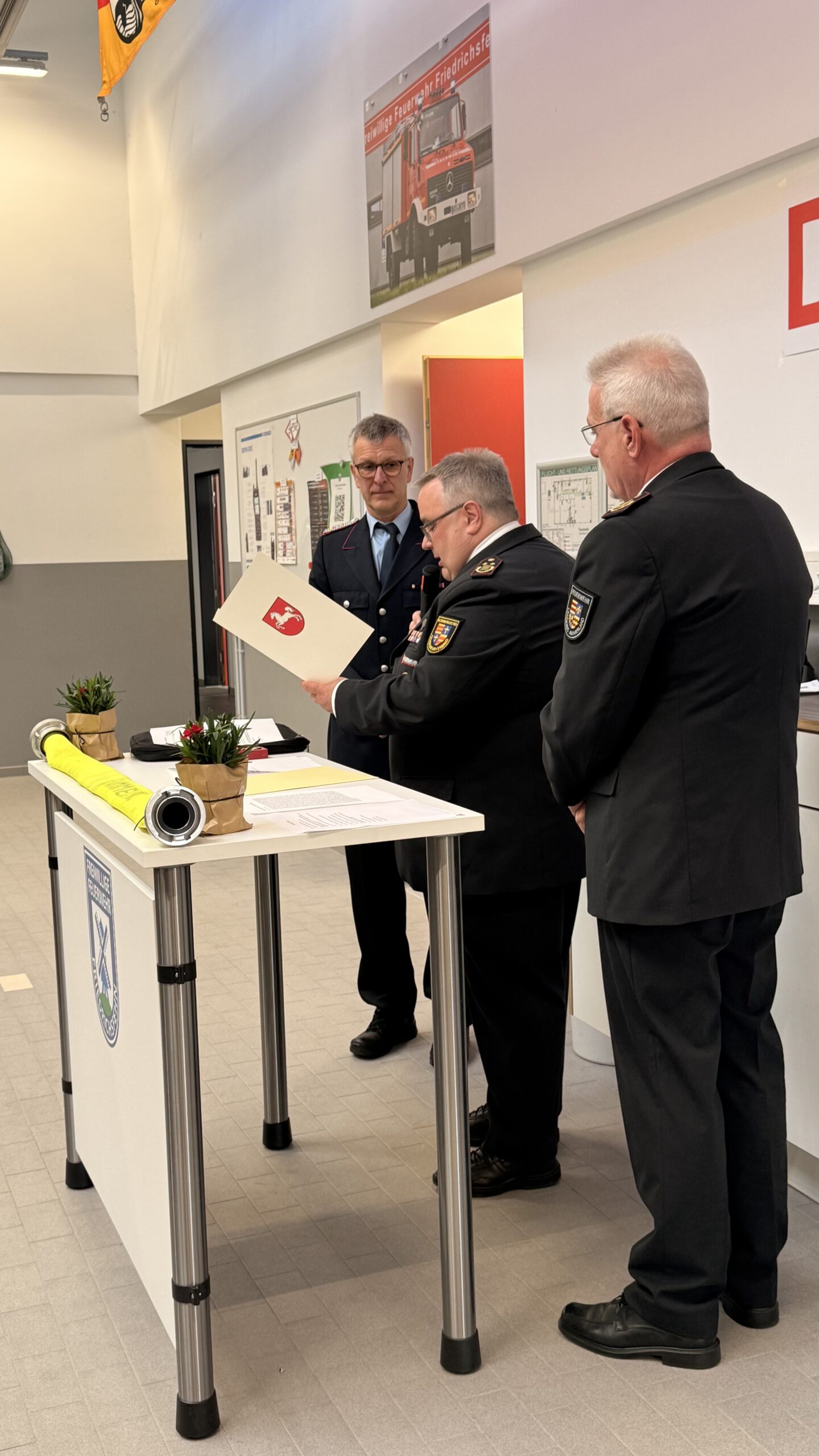Ein besonderes Highlight der Veranstaltung stellte die Ehrung durch Regierungsbrandmeister Udo Schwarz dar: Für seine langjährigen und herausragenden Verdienste im Feuerlöschwesen des Landes Niedersachsen wurde Uwe Hilgen mit der Ehrennadel in Gold ausgezeichnet. Diese hohe Auszeichnung unterstreicht in besonderer Weise seinen unermüdlichen Einsatz und sein außergewöhnliches Engagement über drei Jahrzehnte hinweg.