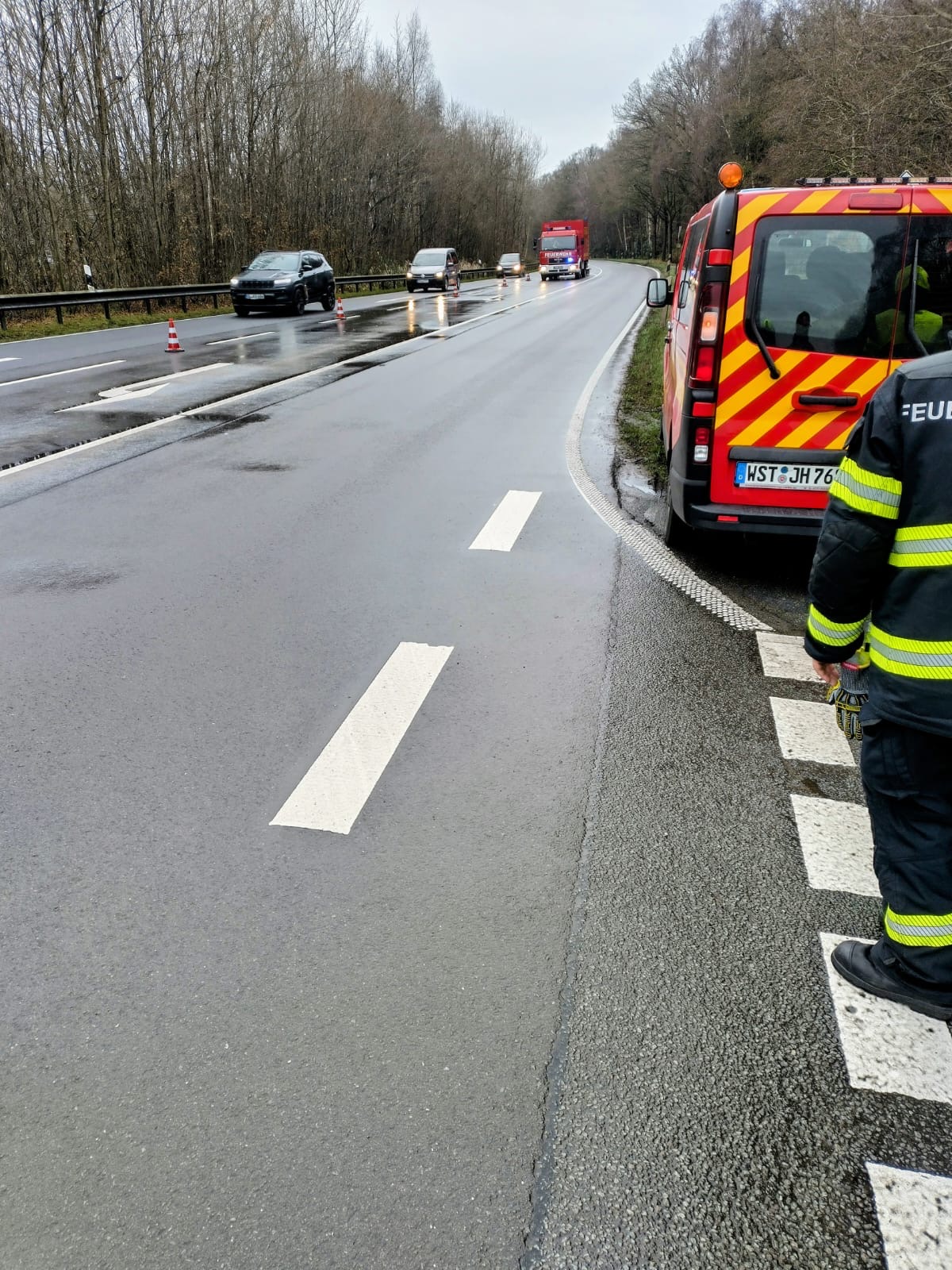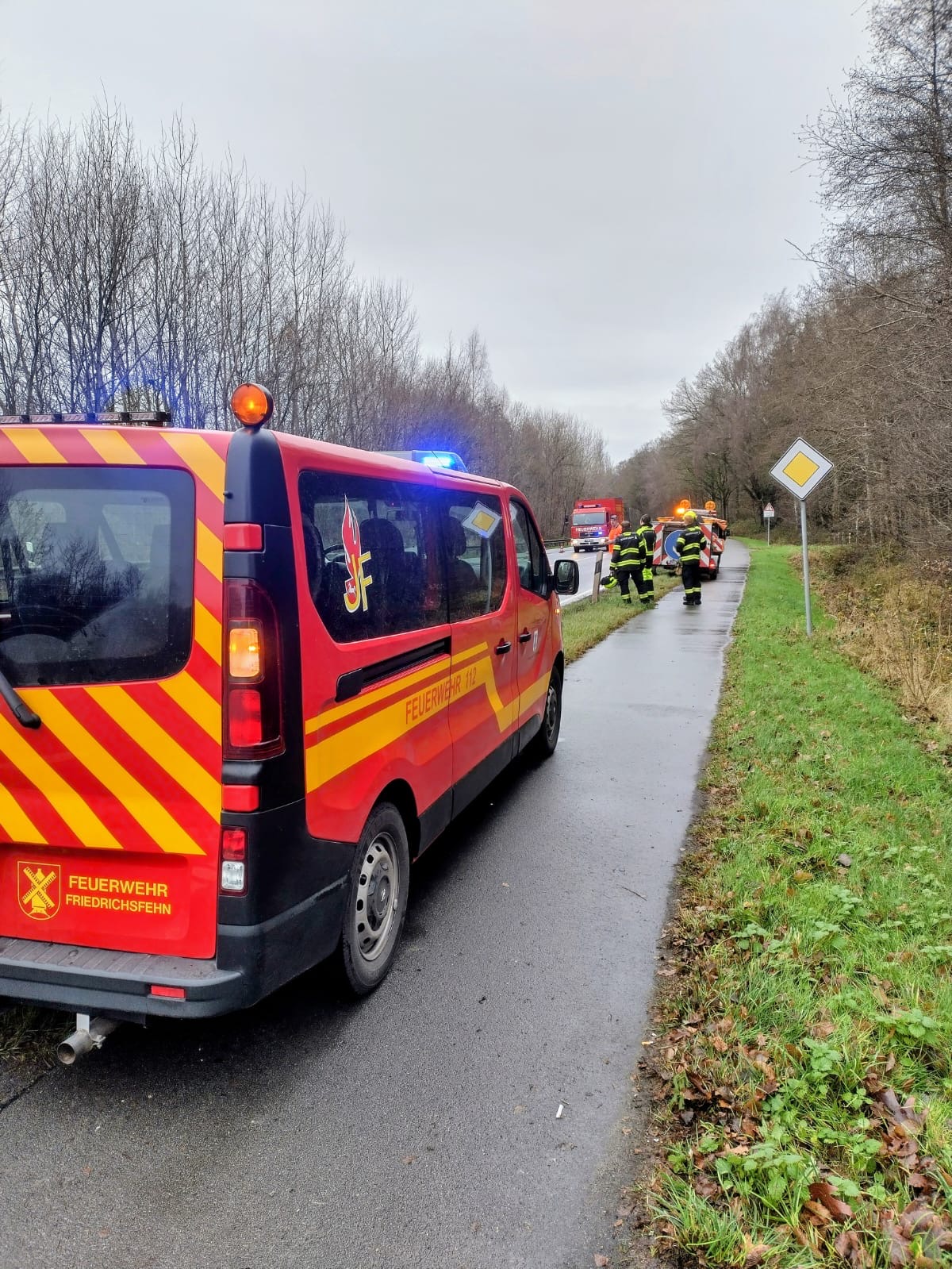 Von der B401 – Höhe Roter Steinweg zog sich die Ölspur bis ins Stadtgebiet Oldenburg. Wir haben vor Ort erste Sicherungsmaßnahmen getroffen, so dass der Gefahrstoff nicht in angrenzende Gräben und die Kanalisation gelangen konnte. Die Absperrmaßnahmen erfolgten dann im weiteren Verlauf durch die Straßenmeisterei Oldenburg und die Reinigung durch eine angeforderte Spezialfirma.