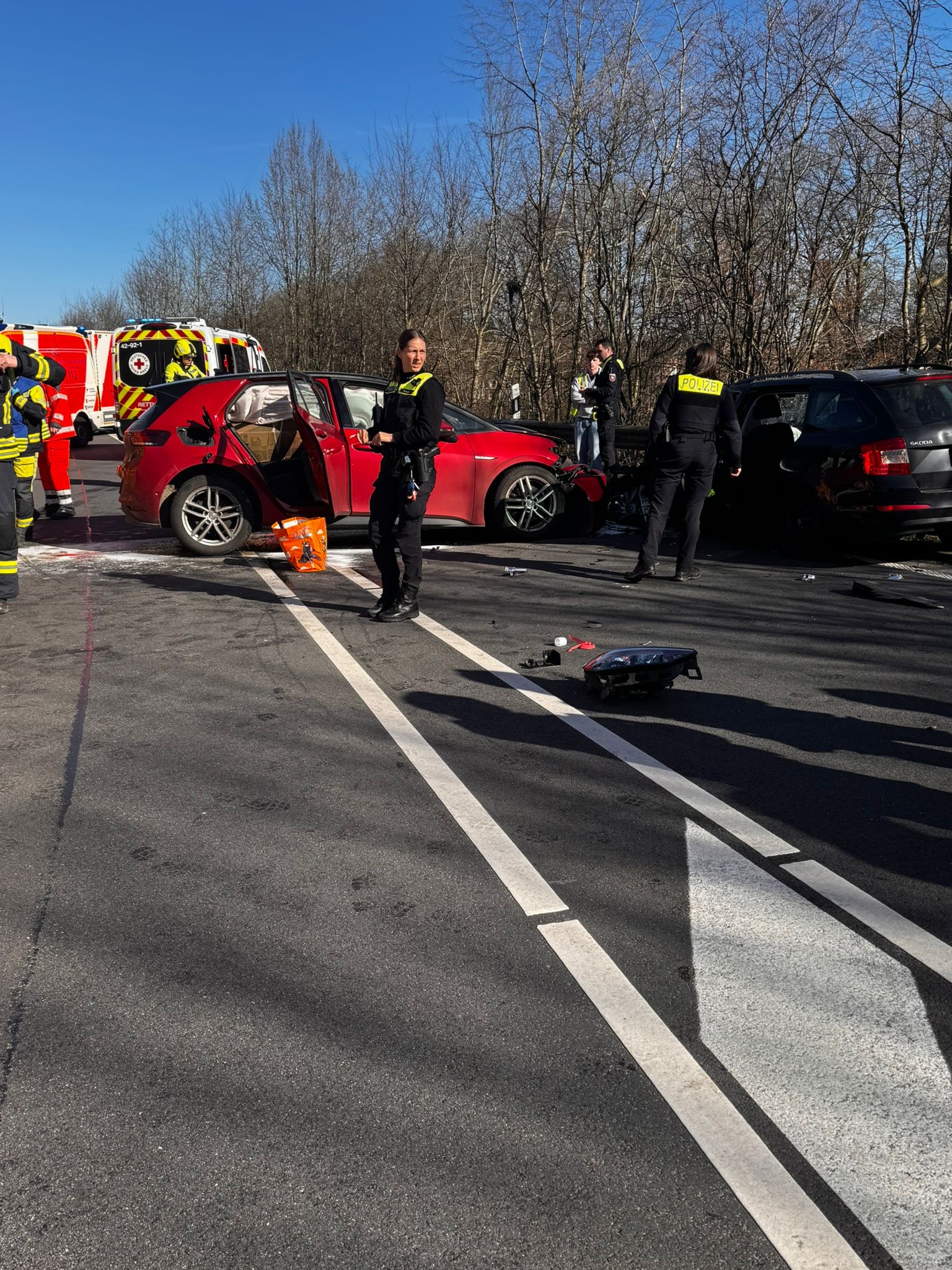 Beim Eintreffen der ersten Einsatzkräfte der Feuerwehr hatten bereits alle Fahrzeuginsassen ihre Fahrzeuge verlassen können, mit Ausnahme eines Kindes, welches ohne weiteres Gerät durch die Feuerwehr aus dem Pkw befreit und anschließend dem Rettungsdienst übergeben wurde.